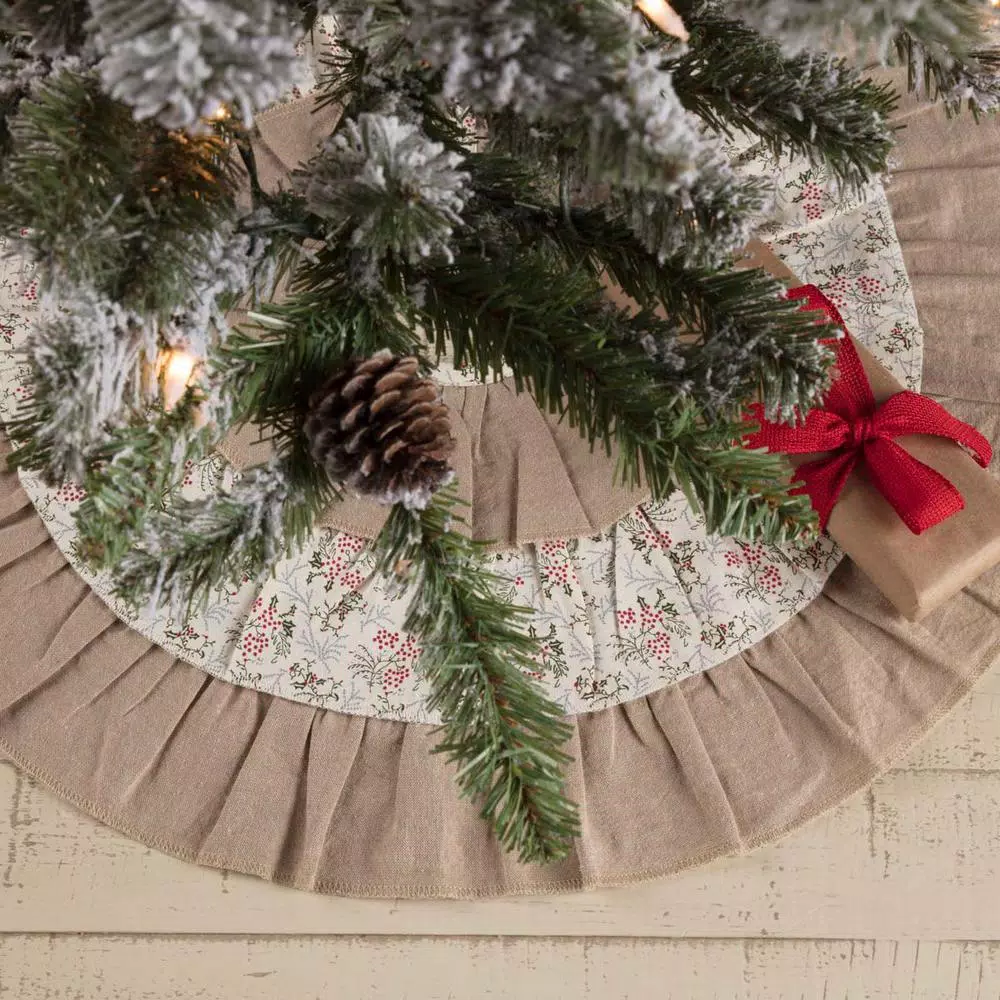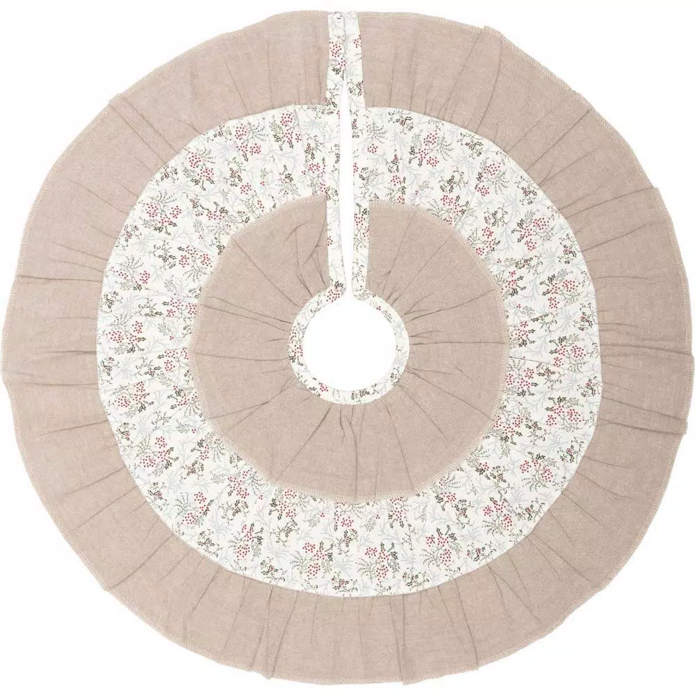 The Carol Tree Skirt is a medley of holiday cheer with its alternating ruffled rings of floral prints on creme and textured khaki chambray. Reverses to solid khaki chambray found on front. 100% cotton shell with flannel lining.