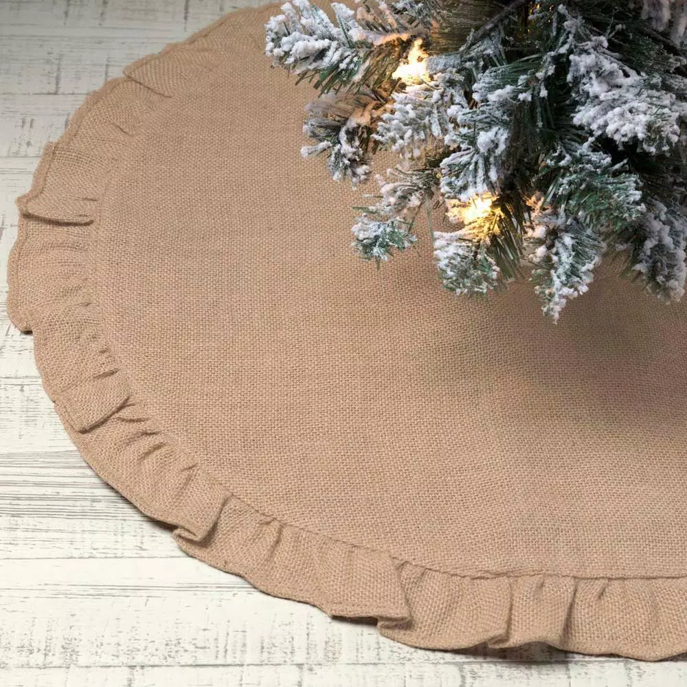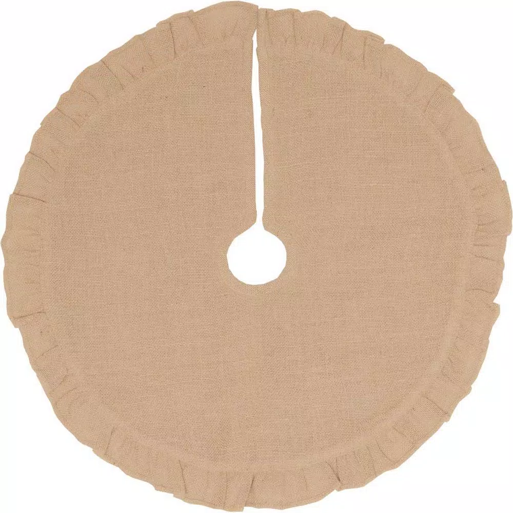 The Jute Burlap Natural Tree Skirt features a raw and unprocessed jute look for an original burlap bag feel. Textured and tactile, this jute is soft enough to prominently feature in your home while maintaining a rough-hewn aesthetic. Finished with half in. fringes hanging from turned cuff to complete this down-to-earth country Christmas look. Lined with flannel for a winter warming effect.