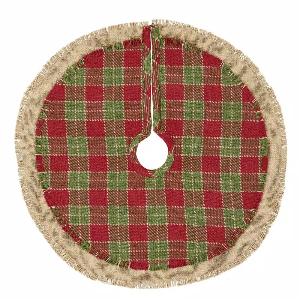 Nothing says in. Home for Christmas in. like a house whose Christmas tree is accented with the Robert Mini Tree Skirt. Masterful weaves create alternating patterns of dominant barn reds and forest greens and trimmed in soft, cotton burlap. The natural burlap layer underneath adds rustic charm and is even reversible so the natural color and accented opening provides another option for your decor.