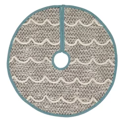 Invite the illusion of relaxing waves under the tree this year with the Sanbourne Mini Tree Skirt. The shiny rope trim is adorned as a wave-inspired pattern over a textured creme and black jacquard cotton. The opening and outside edge is trimmed with 0.5 in. turquoise chambray and reverses to solid creme cotton slob.