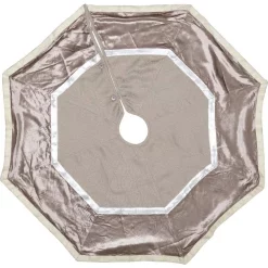 Go for an upscale glitz look this Christmas with Allura. The octagon Allura Tree Skirt 48 in. features greige (grey/beige) jacquard accented with grey shiny viscose velvet with a shimmery silver and taupe diamond trim. Includes 3 button closures and reverses to grey viscose velvet.