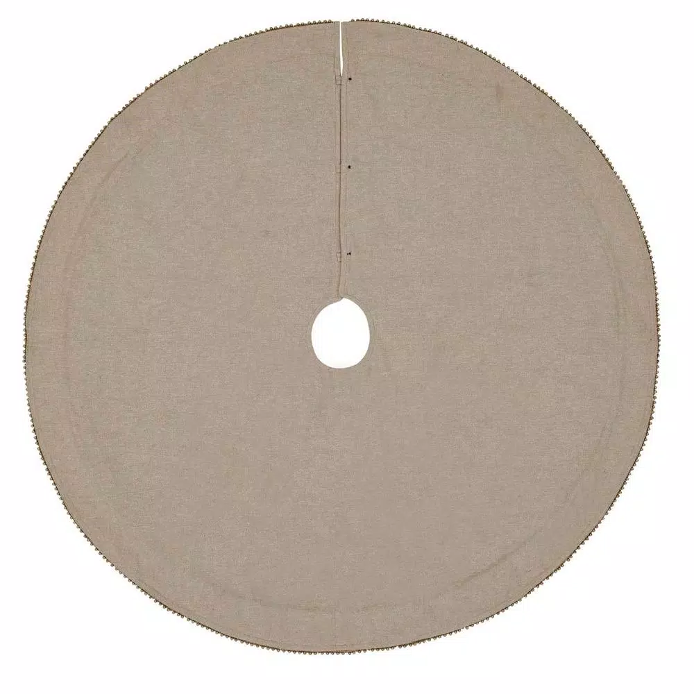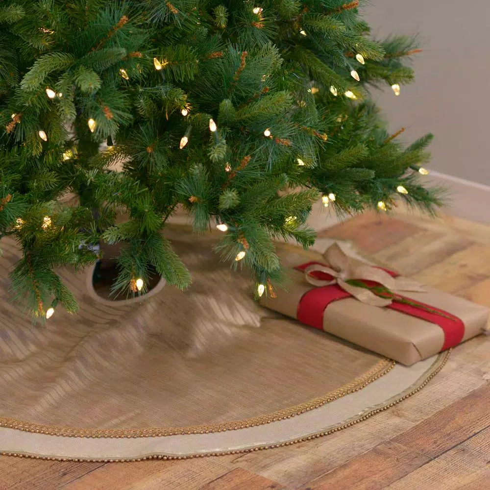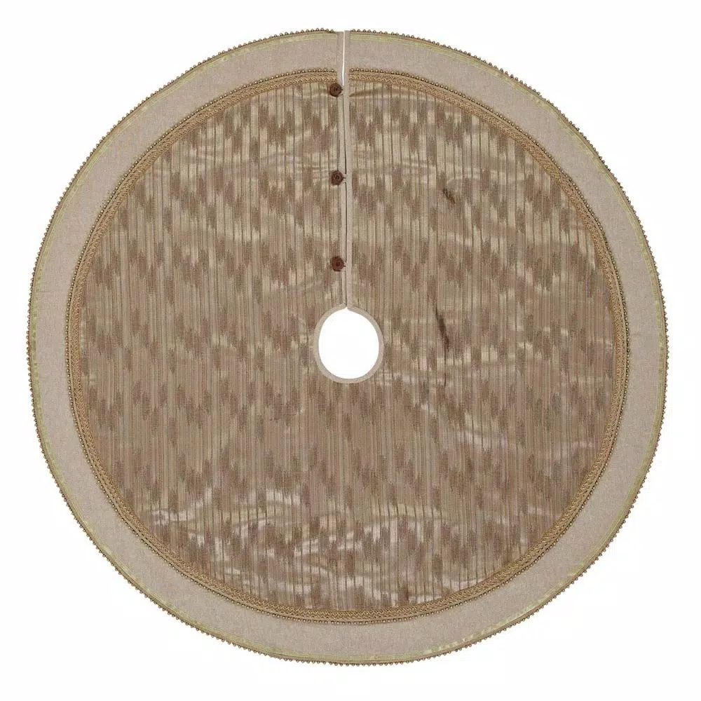 The Celebrate Tree Skirt 48 in. brings out the warmth of Christmas with its khaki and golden adornment. Featuring a central jacquard layer dressed with metallic golden lace and ball trim. Reverses to khaki gold lurex chambray fabric.