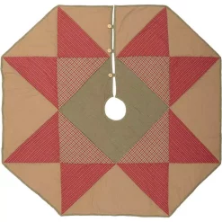 The Dolly Star Tree Skirt features a large 8-point star that radiates from the center and touches the green edge binding. Outside edges have a tan cotton while inside the star displays 2 different plaids. 100% cotton.