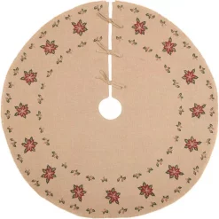 Known as the Christmas Flower, poinsettias are paired with red holly berries on a textured jute base to impart the Jute Burlap Poinsettia Tree Skirt with the warmth and tradition of the shared holiday experience. Finished with 1/2 in. fringed edges. Reverses to solid natural jute burlap matching the color on front.