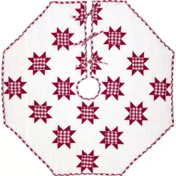 Countrify your Christmas this year with the Emmie Patchwork Tree Skirt. A holiday significant 7 rows of 8-point stars are placed on a bright white background. Reverses to the check found inside the stars. 100% cotton, hand-quilted.