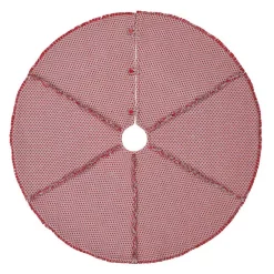 The Tannen Tree Skirt 48 in. stands out with its reverse seams connecting the deep red and nickel grey jacquard fabric, creating a unique impression. The skirt features flannel lining and is trimmed with a soft fringe. Reverses to deep red taffeta with a 5 in. Dia loop with 3 barn red chalk button closures and loops to secure the skirt around the tree.
