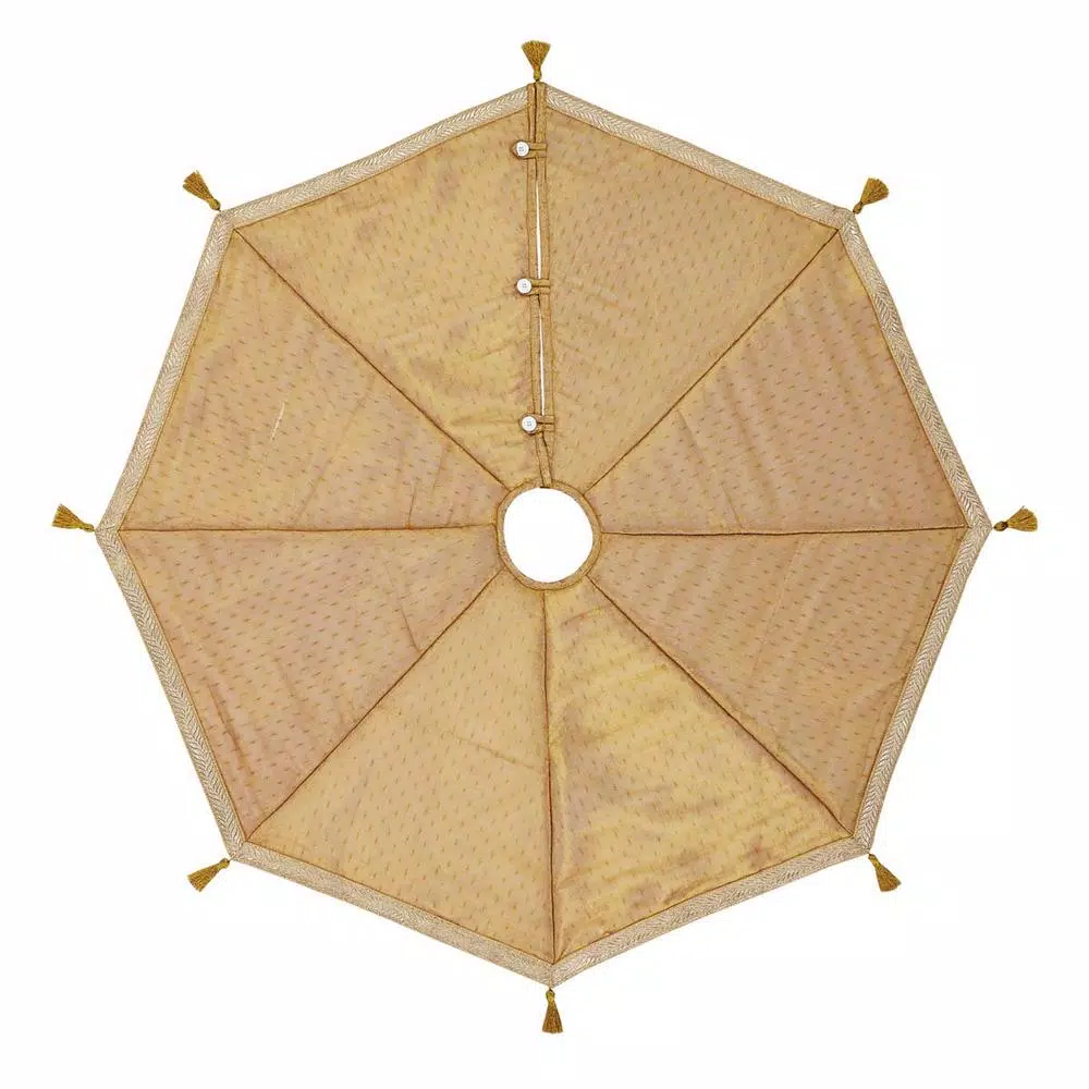 The Tinsel Tree Skirt 48 in. is a glitzy and fun look for Christmas. Features a shimmery gold tulle (fine netting) overlaid on antique white cotton and lined in flannel. Woven with shimmery gold thread pattern filling the octagon shape and accented with gold tassels on each corner, the skirt is sure to be a favorite. Includes 3 button closures and reverses to antique white cotton woven with a shimmery gold thread pattern.