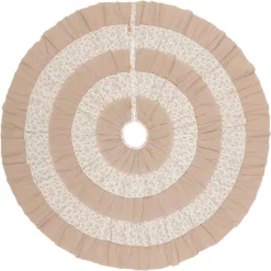The Carol Tree Skirt is a medley of holiday cheer with its alternating ruffled rings of floral prints on creme and textured khaki chambray. Reverses to solid khaki chambray found on front. 100% cotton shell with flannel lining.