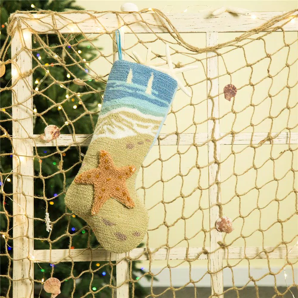 Bringthebeachinsidewithyouwiththisnauticalthemedstocking.Withablueoceanwatercuff,therearewavesandadecorativestarfishdisplayedprominently.HangthisstockinginyourhomeorbeachhousethisChristmastocelebratetheholidayseason.