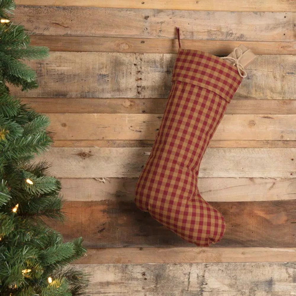 We extended our popular home decor line with holiday cheer in the Burgundy Check Stocking. Now you can add this classic Burgundy Check look above your mantel. This stocking features a burgundy and tan check body and cuff. Finished with hanging loop lined with flannel and taffeta.