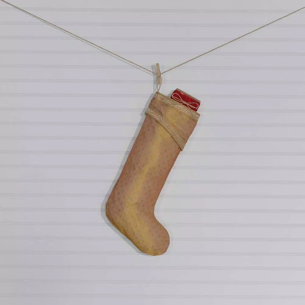 The Tinsel Stocking is an elegant statement for Christmas morning. Features shimmery gold tulle (fine netting) overlaid on an antique white cotton woven with a shimmery gold thread pattern. The slanted cuff is embellished with gold vine trim on both the top and bottom to complete the look.