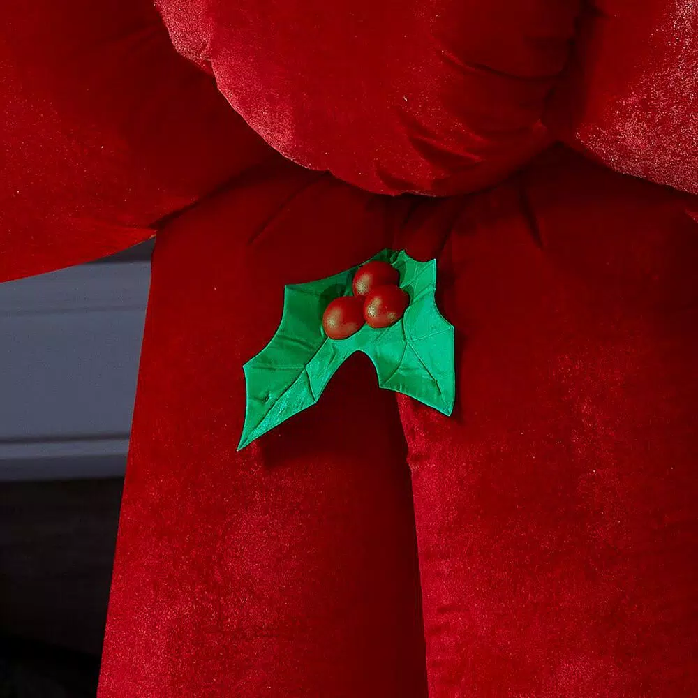 Bring holiday happiness to passersby with this Airblown Inflatable Christmas bow. Featuring soft, velvety red fabric, it includes a loop for hanging and an external spotlight that stakes into the ground. Use it as a standalone piece or group it with other inflatables for a supersized scene. Setup is easy – just plug it in, stake it down and enjoy the fun. Includes everything needed for outdoor setup.