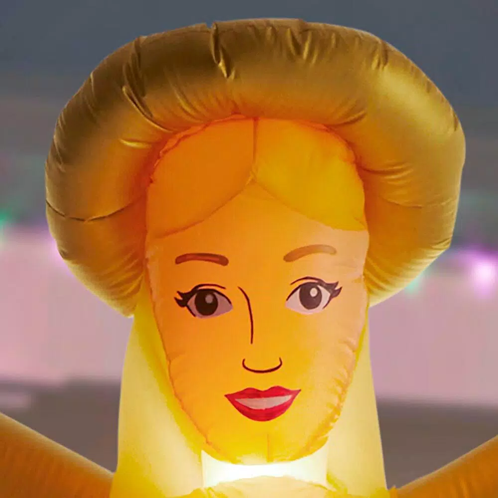 Bring holiday happiness to passersby with this Airblown Inflatable Luxe Angel. Decked out with festive gold metallic accents, this beautiful decoration is perfect for sharing Christmas cheer. Use it as a standalone piece or group it with other inflatables for a supersized scene. Setup is easy – just plug it in, stake it down and enjoy the fun. Includes everything needed for outdoor setup.