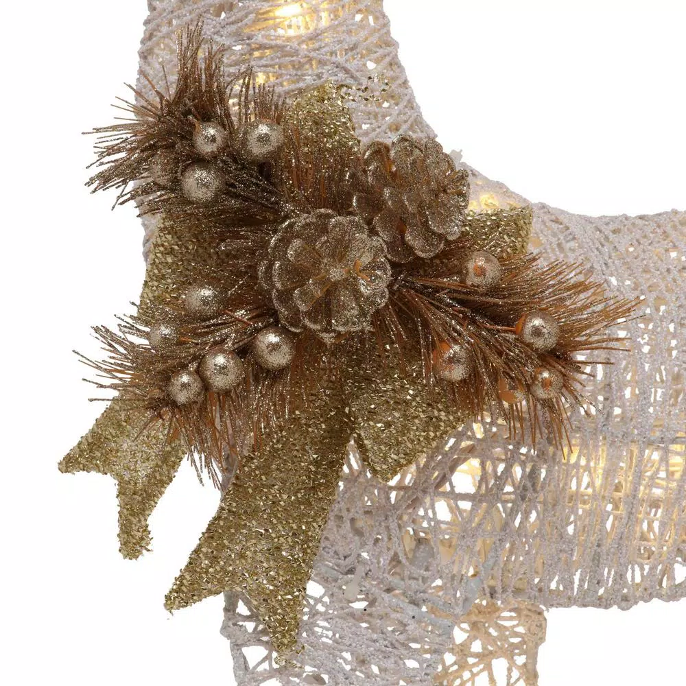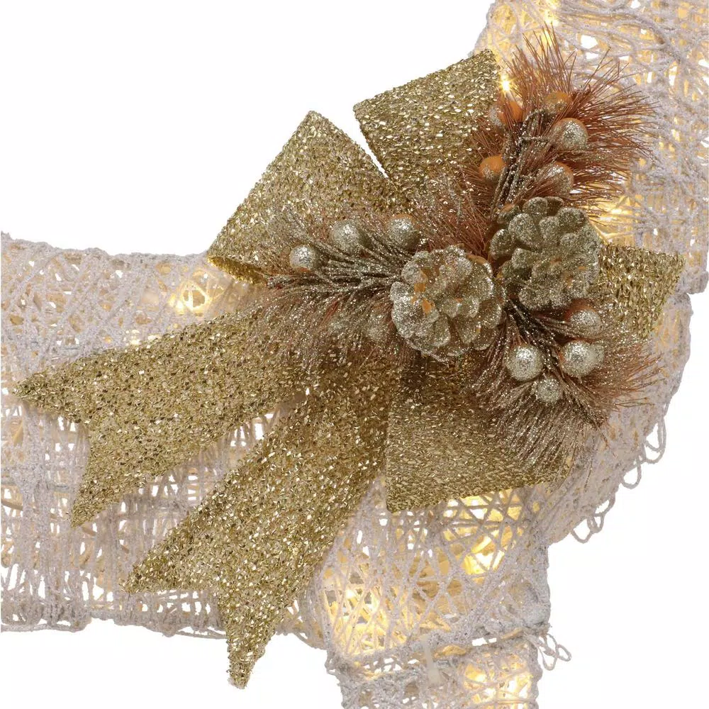 Shimmering and compact, this 36 in. White PVC Deer and 24 in. White PVC Doe from Home Accents Holiday bring an elegant touch to your yard or home. Crafted with a sturdy metal frame, both pieces are decorated with large, gold bows with pinecones and ornaments and covered in weather-resistant PVC. Ideal indoors or out, both pieces are beautifully illuminated with a total of 90 LED lights for a glorious display in the dark.