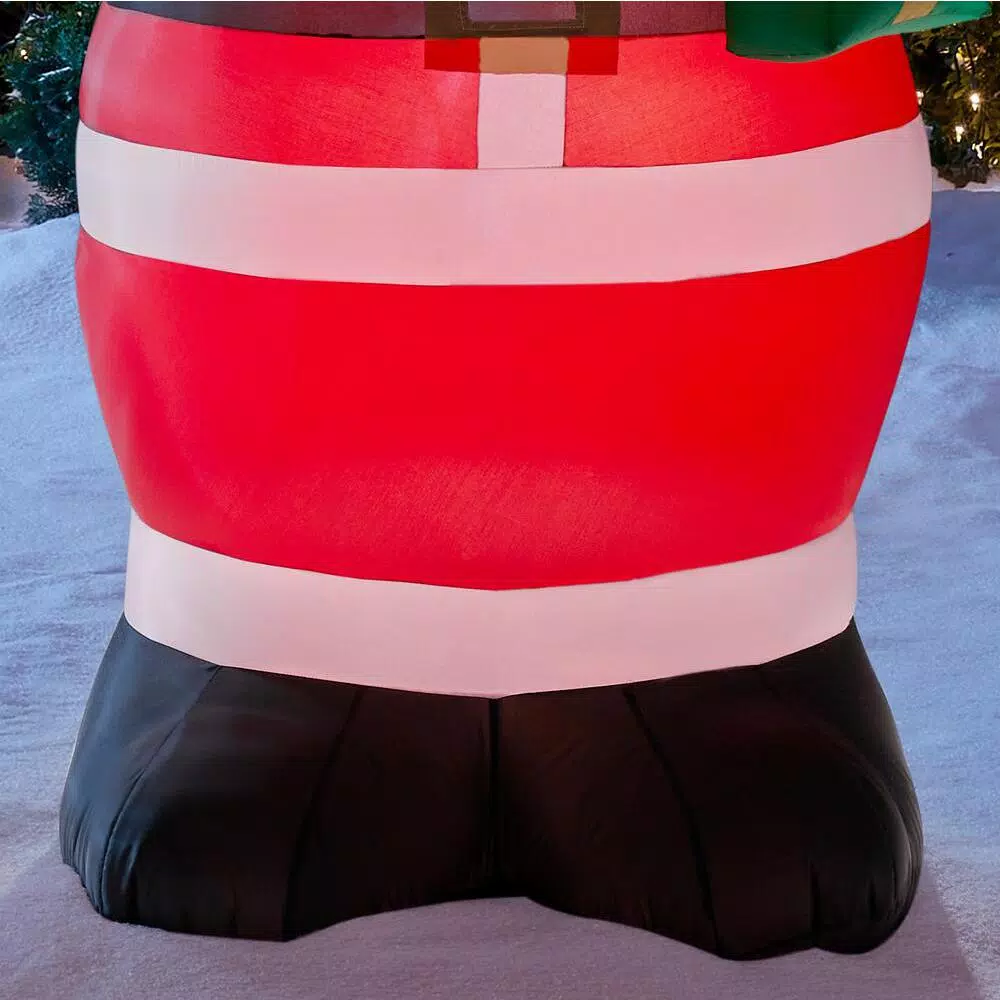 Bring holiday happiness to passersby with this Airblown Inflatable Santa. Featuring jolly Santa holding a present, this adorable decoration is perfect for sharing Christmas cheer. Use it as a standalone piece or group it with other inflatables for a supersized scene. Setup is easy – just plug it in, stake it down and enjoy the fun. Includes everything needed for outdoor setup.