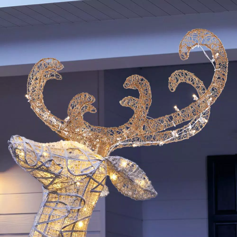This head-turning yard sculpture will be the star of your holiday display. Featuring 240 stunning LED lights, this 84-in. jumping deer decoration is made with a durable metal frame and weather-resistant fabric. Use this charming Christmas character in either indoor or outdoor spaces. The long-lasting bulbs remain cool to the touch and will shine through the season. The sculpture is easy to set up, and it includes ground stakes.